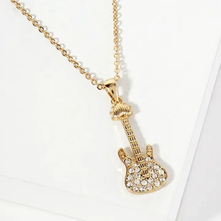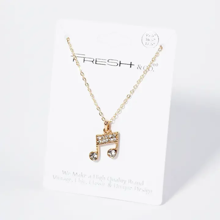 Rhinestone Embellished Metal Music Notes Pendant Necklace | Gold
